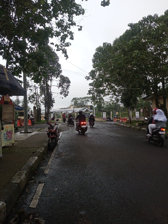 The image captures an overcast daytime street scene in Chagzam_Pam, Bhutan, featuring a wet asphalt road and damp concrete sidewalks. In the left foreground, a dark-colored scooter is parked on the sidewalk beside a light-colored vending cart displaying "PEPER PEDAS" and a red sign with "Rp. 5000". A utility pole with overhead power lines stands near the cart. On the wet road, multiple motorcycles and scooters are in motion. In the right foreground, a motorcycle with two riders travels away from the camera; the passenger wears a white head covering. Further down the road, at least three additional motorcyclists, wearing dark clothing and helmets, are also proceeding away from the camera, their brake lights illuminated. The road is bordered by a concrete curb and abundant green foliage from numerous trees. In the mid-ground and background, more trees, additional power lines, various signs, and orange barriers are visible, along with a distant structure possibly covered by a white canopy or tent. The overall lighting is diffused, indicative of a cloudy sky.