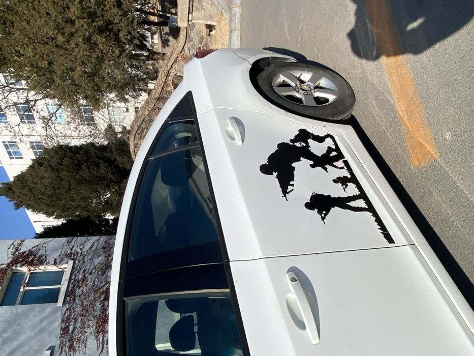 A white car is parked on a gray asphalt surface near a yellow line. The car's side door features a black silhouette graphic depicting several armed soldiers in combat poses. A building with windows and ivy is visible in the background, along with trees and a clear blue sky. The car's wheel and tire are also visible, suggesting a focus on the vehicle and its design elements.