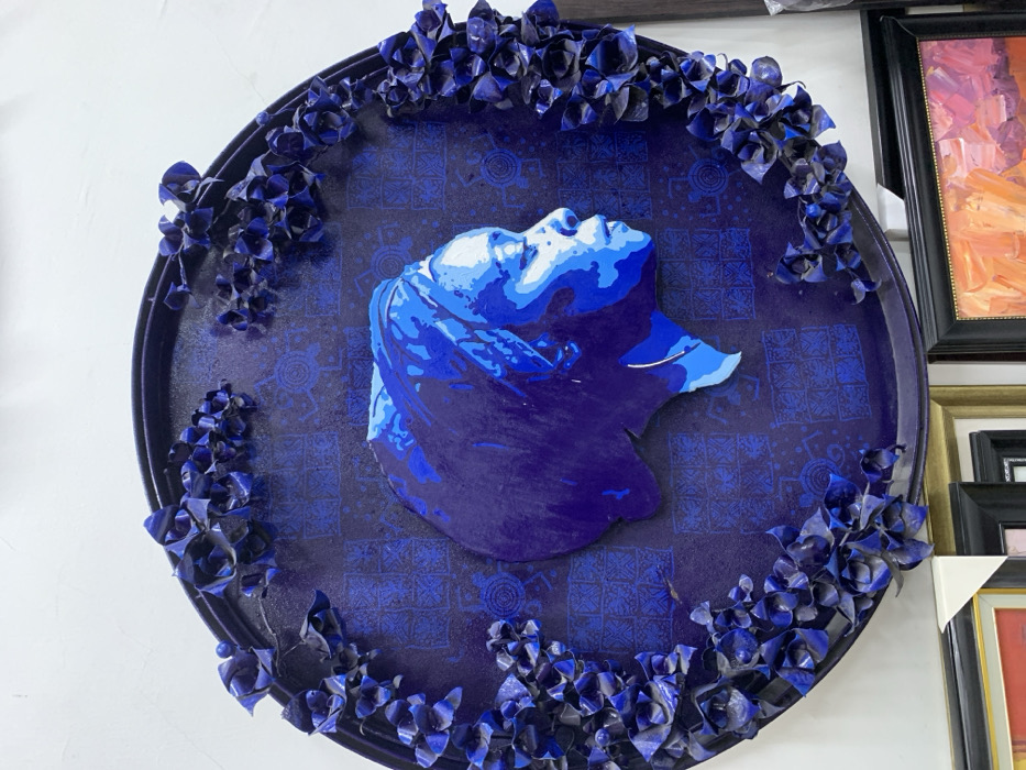 The image displays a mixed-media artwork within a likely gallery or art shop setting in Ikate, Nigeria. The central subject is a large, circular art piece predominantly in shades of blue and purple. A profile silhouette of a woman facing left, adorned with a headwrap and an earring, occupies the center, rendered in varying tones of blue to create facial contours and depth. The circular background features a dark blue color with a subtle, repeating patterned texture resembling block prints or traditional motifs. Along the outer perimeter of the circular artwork, clusters of dark blue, crinkled, petal-like elements are affixed, creating a textured, floral-like border. The artwork is mounted against a plain white wall. Below the main artwork, the top edges of several other framed paintings are visible, indicating an exhibition or retail environment. These frames include black, gold, and white options, with glimpses of canvas paintings featuring broad brushstrokes in warm tones like orange, red, and yellow.