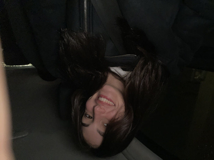 A woman smiles with her head tilted. She has dark hair and fair skin. She wears a dark jacket with a furry hood. The background is dark and undefined, appearing to be indoors. The photo is rotated, and part of her arm is visible in the lower left corner.