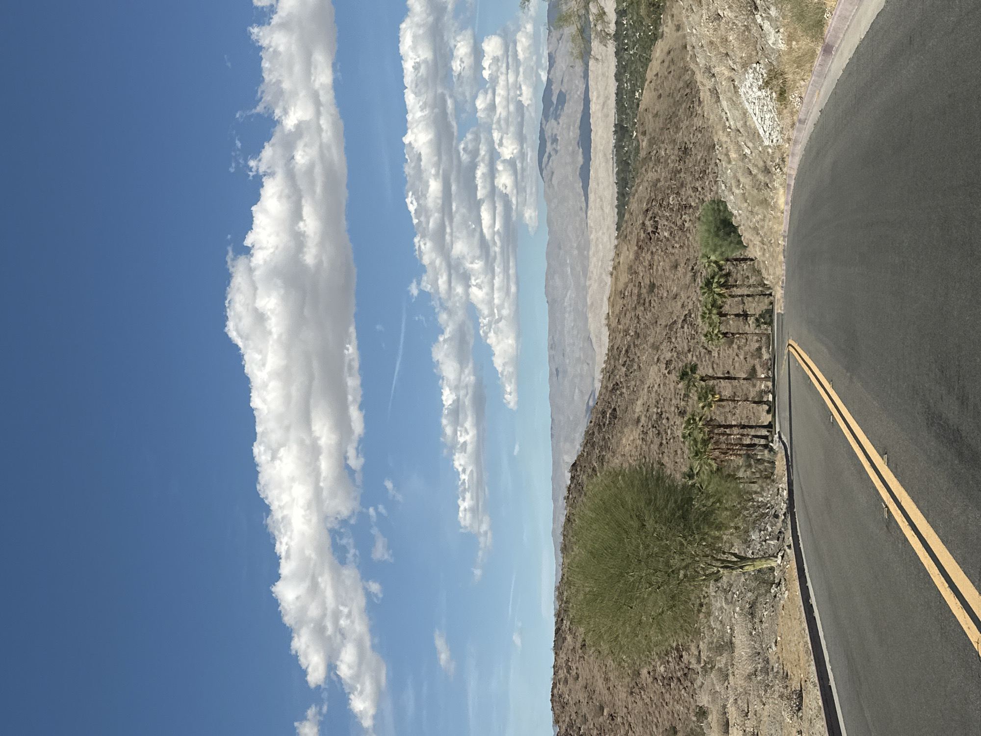The image depicts a view of a road winding alongside a desert mountain landscape. The scene is likely in Rancho Mirage, United States, based on the arid environment and vegetation. The sky is predominantly blue with scattered cumulus clouds. The road itself is asphalt with a double yellow centerline, indicating a no-passing zone. The terrain consists of rocky, arid mountain slopes with sparse vegetation, including low bushes and several palm trees lining the roadside. A portion of a neighboring mountain range is visible in the distance.