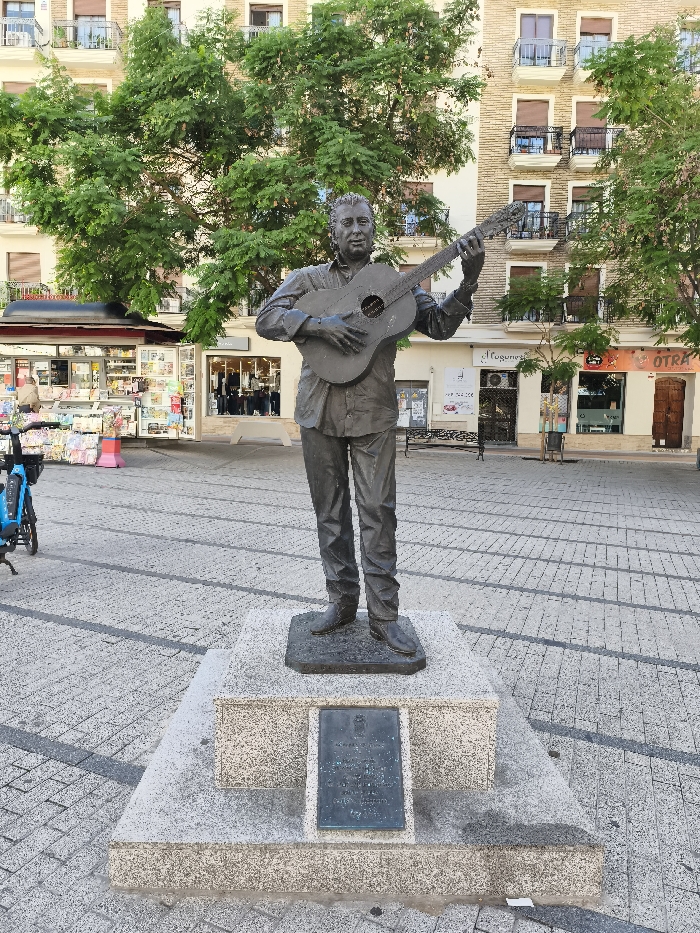 The image depicts a bronze statue of a man playing a guitar, positioned in a public square within the city of Unknown, Unknown