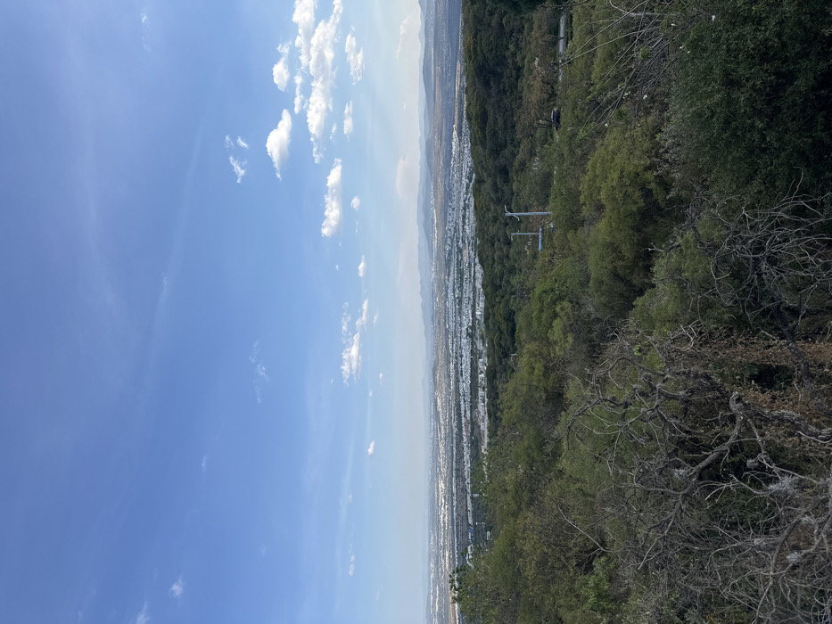 This image displays a panoramic view from an elevated position, overlooking a portion of Zibatá, Mexico. The scene is dominated by a clear, bright blue sky in the upper two-thirds, featuring scattered white cumulus clouds that are more concentrated towards the right horizon. The foreground, occupying the lower third, consists of dense, mixed vegetation, including vibrant green foliage and sections of dry, tangled, bare branches with some vines. Two light-colored utility poles are visible upright amidst the trees slightly to the right of the frame's center. A dark-colored vehicle, appearing to be an SUV, is partially discernible on a paved road cutting through the forested area on the right side of the mid-distance. Beyond the immediate tree line, the midground reveals a sprawling urban landscape comprised of numerous light-colored residential and commercial structures, characteristic of a developing planned community. Hazy, dark outlines of distant hills or mountains are visible along the far horizon. No individuals, discernible actions, or interactions are present in the scene.