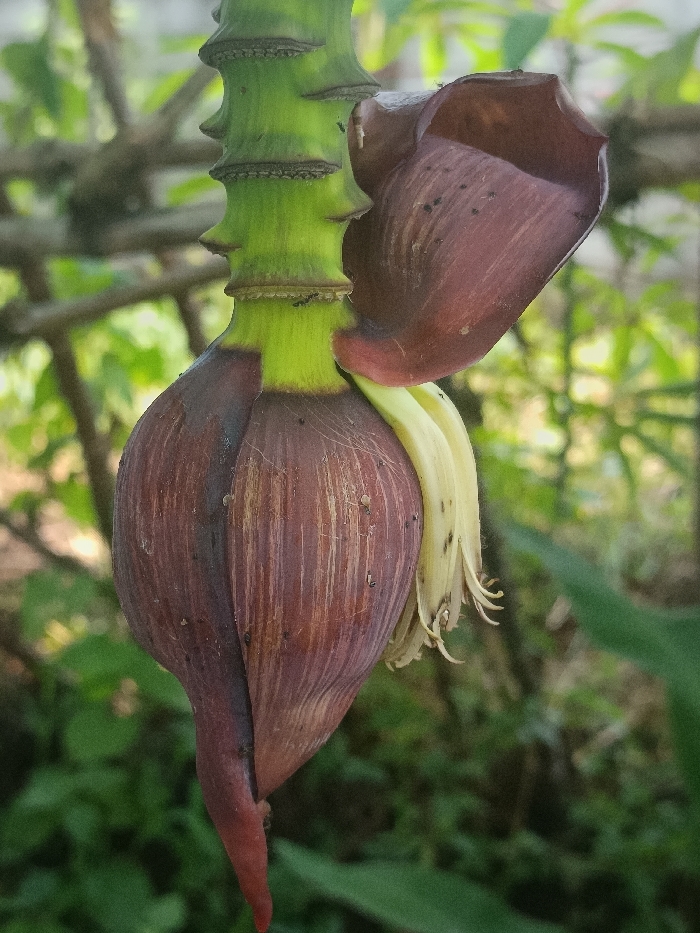 - "A close-up, vertical photograph details a developing banana blossom (*Musa acuminata*) attached to a bright green, segmented stem" by FM-78kfH2, licensed under CC BY 4.0