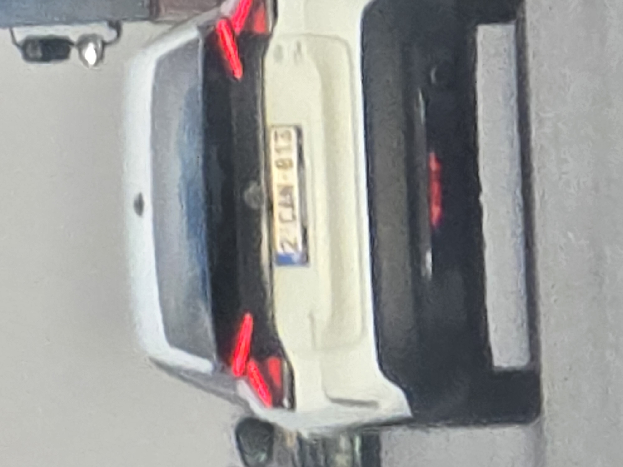 The scene is located in the city of Yazdach, Bulgaria. The image presents the rear view of a white passenger vehicle, appearing to be a crossover or SUV, observed under diffuse lighting conditions. The vehicle's lower rear bumper is black, contrasting with the white bodywork. Its red tail lights are illuminated, positioned high on the rear corners. A rectangular license plate, white with black alphanumeric characters "2 CAN-813", is mounted centrally on the rear hatch; a blue strip is visible on the left side of the plate. To the far right of the frame, a portion of a larger, darker vehicle, possibly a truck, is visible, including a side mirror with an illuminated light. The ground surface visible beneath the white vehicle is a light gray, indicating a paved area. No individuals, specific actions, or interactions are discernible within the frame.