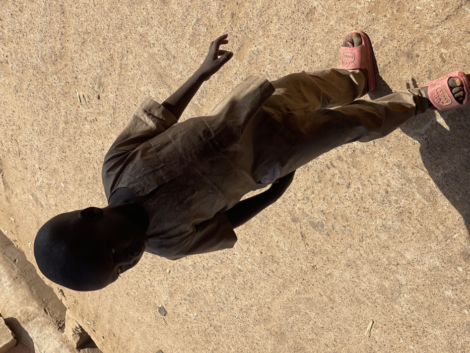 A young child with dark skin and short dark hair stands on a light brown, hard-packed ground surface in Samaru, Nigeria