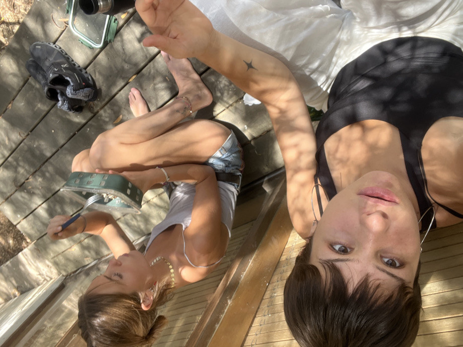 Two women are outside on a wooden deck. One woman, facing the camera, wears a black tank top and large silver hoop earrings, with short dark hair. The other woman, farther away, wears a white tank top and jean shorts, working on something with a tool. Her hair is pulled back in a ponytail. A pair of black athletic shoes sit on the deck, along with a white sheet. The arm of the second woman, extended towards the camera, has a star tattoo. The image is taken from an overhead perspective, tilted slightly.