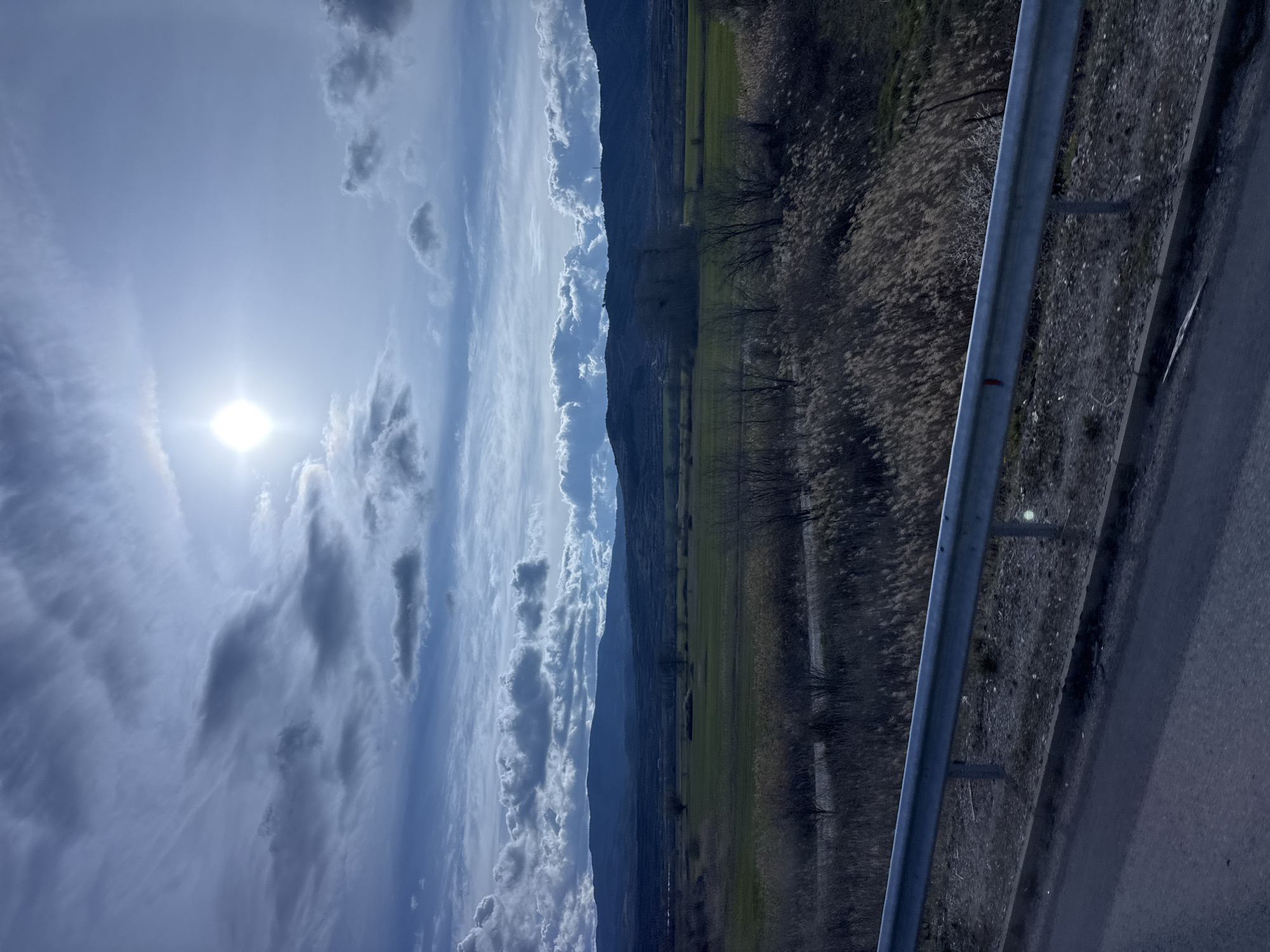 The photograph presents a landscape view from the city of Mursalevo, Bulgaria. A road is visible in the foreground, with a metal guardrail running along its edge. Beyond the road, there is a grassy field bordered by trees, and in the distance, there are mountains. The sky is filled with clouds, and the sun is visible. The overall lighting is bright.
