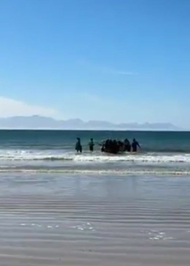 group of people in the water at a beach on a clear, sunny day. The people are clustered together, some wearing vests. They appear to be pushing or guiding something toward the shore. In the background, across the water, are mountain peaks. The beach itself is sandy with visible ripples from the receding tide.