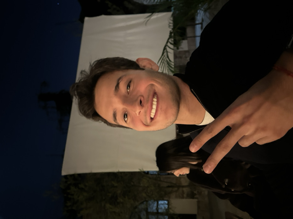 A young man smiles and gives a peace sign. He has short brown hair and is wearing a dark jacket over a white shirt. A woman with long dark hair stands behind him. In the background are a white tent, some plants, a dark blue sky, and a building with lit windows. The photo is taken at night and slightly angled.