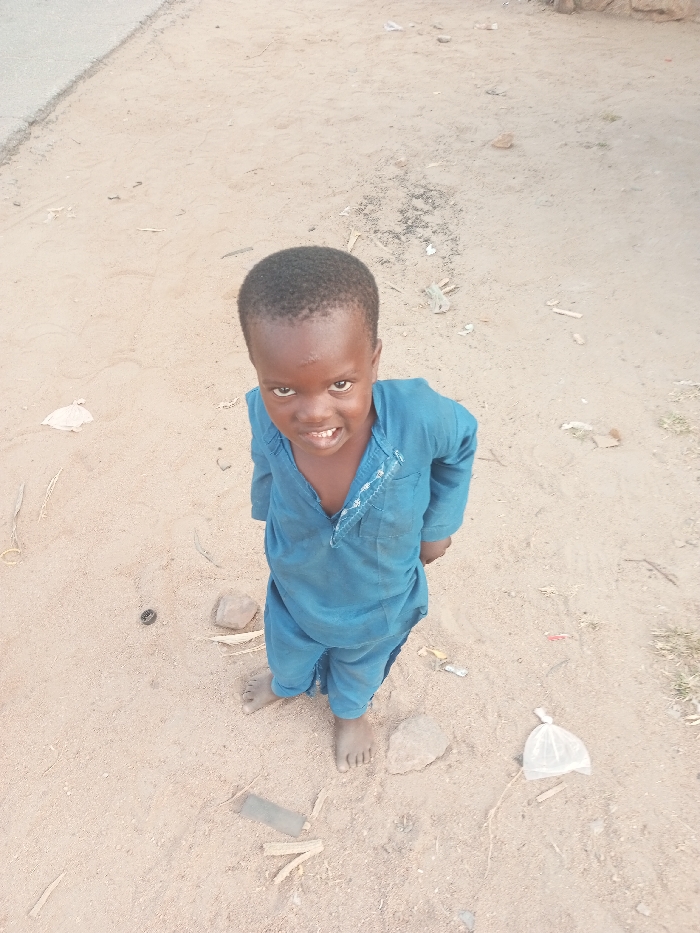 A barefoot child in a blue outfit stands on a sandy surface, smiling slightly at the camera. The outfit features decorative stitching near the neckline. The background is cluttered with small rocks, pieces of plastic, and other debris scattered across the ground. The overall impression is one of simplicity and unadorned surroundings.