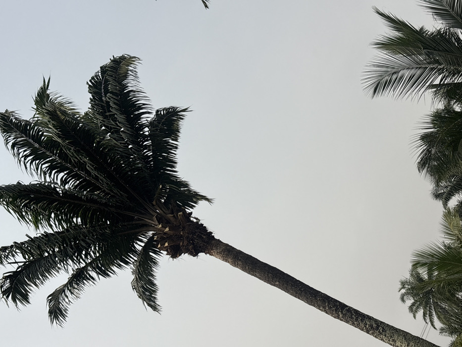 - "A single tall palm tree with a dark, slender, textured trunk extends diagonally from the lower-left foreground towards the upper-right midground" by FM-tJzt82, licensed under CC BY 4.0