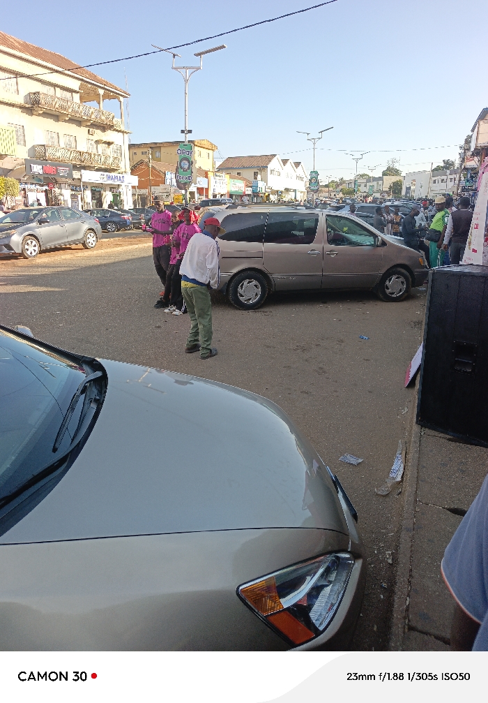 This image depicts an urban street scene in Jos, Nigeria. In the immediate foreground, the hood and partial front right fender of a light-colored sedan are visible, angled away from the viewer. To its right, a concrete curb delineates a narrow, debris-strewn sidewalk. In the midground, a paved road extends into the distance. On the left side of the road, a group of four individuals, predominantly wearing pink/magenta shirts, stands near a parked silver sedan. Slightly to their right and closer to the foreground, a man in a white jacket, red cap, yellow undershirt, and olive-green pants stands facing away from the camera, looking towards the group in pink. A gold-colored minivan is parked horizontally across the road further right, partially obstructing the street. On the right sidewalk, a large, dark rectangular object, possibly a speaker, is present. The background features multi-story buildings lining both sides of the street. On the left, a prominent building with multiple balconies displays a "MAMA'S" sign on its ground floor. Several lampposts equipped with solar panels are visible, some bearing "O'Pay Food" banners. The street recedes into the distance, revealing additional vehicles and pedestrians, indicating a busy urban environment. The sky is clear blue.