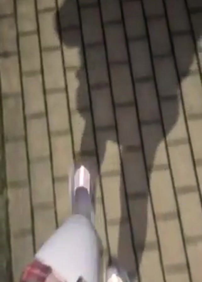two people walking on a brick sidewalk. The camera is positioned low to the ground, likely held by one of the walkers, focusing on their feet and the ground. One person is wearing grey shoes and light-colored pants, and the other person has blue shoes. Shadows are visible, indicating a light source, possibly overhead. The bricks on the sidewalk are light-colored and appear evenly spaced. The ground is slightly uneven.