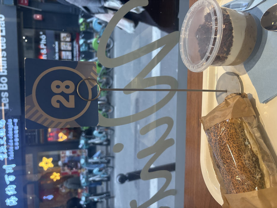 A photograph captures a view from inside a commercial establishment looking out onto a city street in Paris, France. In the immediate foreground, a white serving tray rests on a wooden counter. On the left side of the tray, a baguette sandwich, covered in poppy seeds, is partially enclosed in clear plastic and a brown paper sleeve. Centrally located on the tray is a silver table number holder, displaying a square blue card with the number "28" in white, encircled, with diagonal stripes. To the right of the holder, a clear plastic cup contains a layered dessert, topped with dark chocolate crumble, placed on a light blue paper napkin. A silver spoon is partially visible beside the dessert. White, wavy decorative decals are affixed to the interior of the window glass. Beyond the window, a street scene unfolds. A row of light blue and green rental bicycles is parked along the opposite curb. Pedestrians are visible in the background, out of focus, moving on the sidewalk. Across the street, two storefronts are discernable. The left storefront features illuminated yellow star decorations and signage including "Table de Chengdu" (Table of Chengdu) and Chinese characters. The right storefront displays "Les Bo buns de Liao" and "h&Phơ", indicating establishments specializing in Asian cuisine. The French text and presence of city rental bicycles (similar to Vélib') confirm the location as Paris, France.