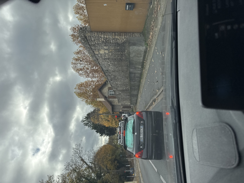 The image captures an overcast autumn day scene from inside a vehicle looking forward on a residential street in Caen, France