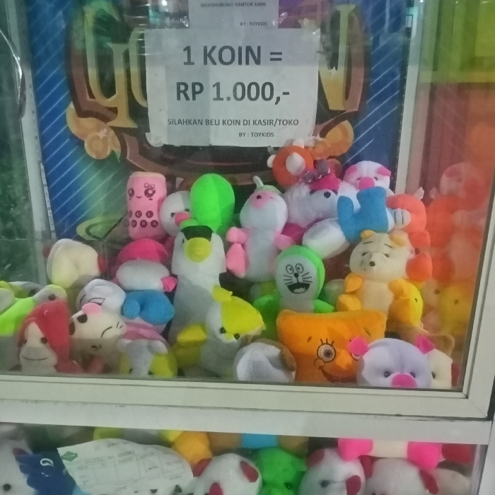 This image depicts the interior of a claw crane game machine, located in Kedung Dowo, Indonesia