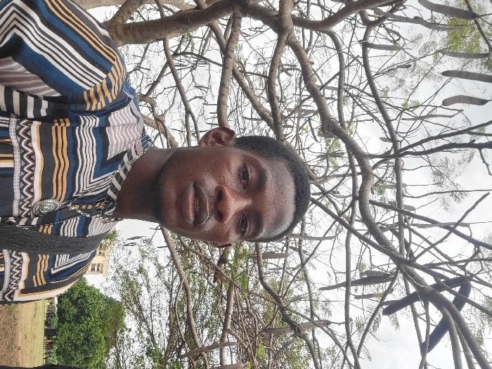 A man with dark skin and a neatly trimmed beard and hair is seen in a portrait shot taken outdoors. He is wearing a patterned shirt with black, white, blue and beige stripes. Behind him, there is an overcast sky filled with a dense network of tree branches. The background also includes greenery, and what appears to be a building. The overall impression is one of a casual, outdoor setting.