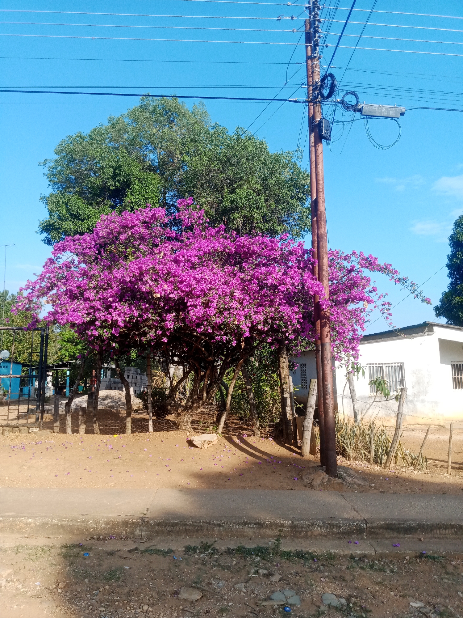 The photograph shows a street scene in Caño de Indio, Venezuela. A tree with vibrant purple flowers dominates the center of the frame, partially obscuring a green-leafed tree behind it. The ground beneath the purple-flowered tree is scattered with fallen blossoms. To the right, a weathered utility pole stands with tangled wires extending across the clear blue sky. A simple, white building with barred windows is visible behind the pole. A fence constructed from thin, upright wooden posts and wire runs along the property line, and a narrow, cracked sidewalk separates the dirt road from the fenced area. The scene appears to be a residential area.