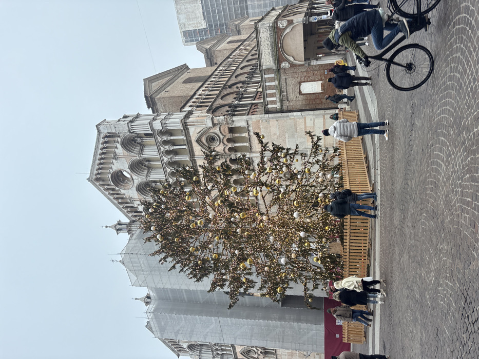 The scene depicts a public square in Ferrara, Italy, situated directly in front of the Ferrara Cathedral (Cattedrale di San Giorgio) under an overcast sky. A large, conical evergreen Christmas tree, heavily adorned with small white lights and numerous gold and white spherical ornaments, stands centrally, surrounded by a low, light-colored wooden picket fence. The cathedral, a multi-tiered stone edifice showcasing Romanesque-Gothic architecture with elaborate arches and columns, forms the primary background. Its left section is partially obscured by white construction scaffolding. The ground is paved with dark, patterned cobblestones. Approximately fifteen individuals are visible. Several people, clad in winter coats, puffer jackets, and beanies, are congregated near the Christmas tree, some observing it. In the right foreground, a person wearing a green vest over a dark hoodie, jeans, and a dark beanie is actively riding a black bicycle from left to right across the cobblestone surface. Other pedestrians are distributed throughout the square, walking in various directions.