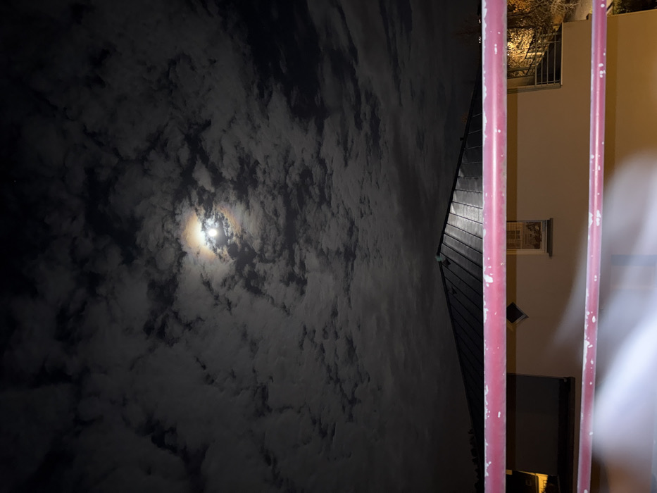 The image displays a nighttime scene in Acigné, France, viewed from an elevated perspective. The upper two-thirds of the frame are occupied by a dark sky heavily covered with layered clouds. A bright moon, located in the upper-right quadrant, is visible through the clouds, exhibiting a distinct iridescent corona with yellow, orange, blue, and green color variations. Below the horizon, the dark, sloped roof of a building, likely composed of metal or slate panels, is prominent, reflecting moonlight. Beneath the roof, a light-colored exterior wall of the building is visible. This wall features a small, dark, diamond-shaped window opening to the left of center. To its right, a rectangular window with visible interior blinds or a grid pattern is present. Along the right edge of the building, a section of an exterior staircase with dark treads and a light-colored railing ascends. The lower portion of the building wall appears artificially illuminated. In the immediate foreground, two parallel, horizontal red bars, consistent with a railing or barrier, traverse the bottom of the frame. These bars show signs of wear with scattered white specks. No individuals or active subjects are present in the scene.
