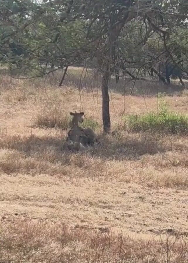 - "The scene shows a medium shot of a deer lying down under the shade of a tree in a field of dry, brown grass" by FM-5vaC62, licensed under CC BY 4.0
