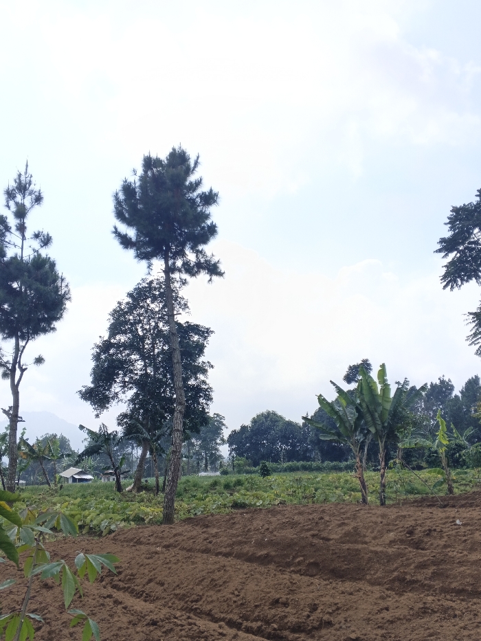 A vibrant landscape showcases a cultivated field with freshly turned brown soil in the foreground. Tall pine trees and banana trees punctuate the verdant midground, which is filled with lush foliage and a variety of other plants. In the distance, a small white building is visible, nestled among the greenery. A backdrop of hills and a cloudy sky complete the scene.