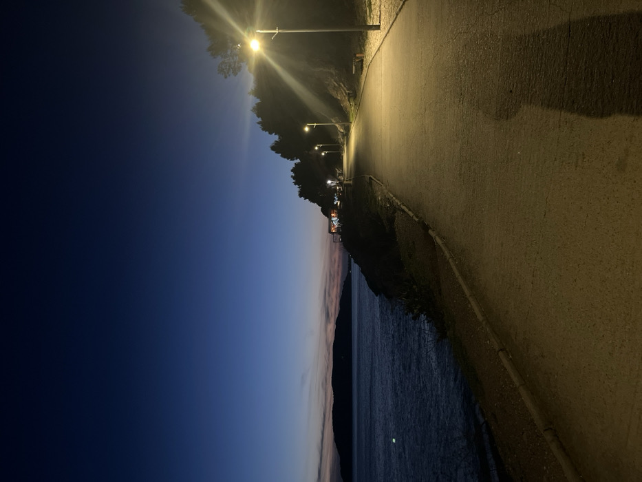 - "A nighttime scene featuring a paved path illuminated by streetlights, lined with foliage on one side and bordering a body of water on the other" by FM-qbOPh2, licensed under CC BY 4.0