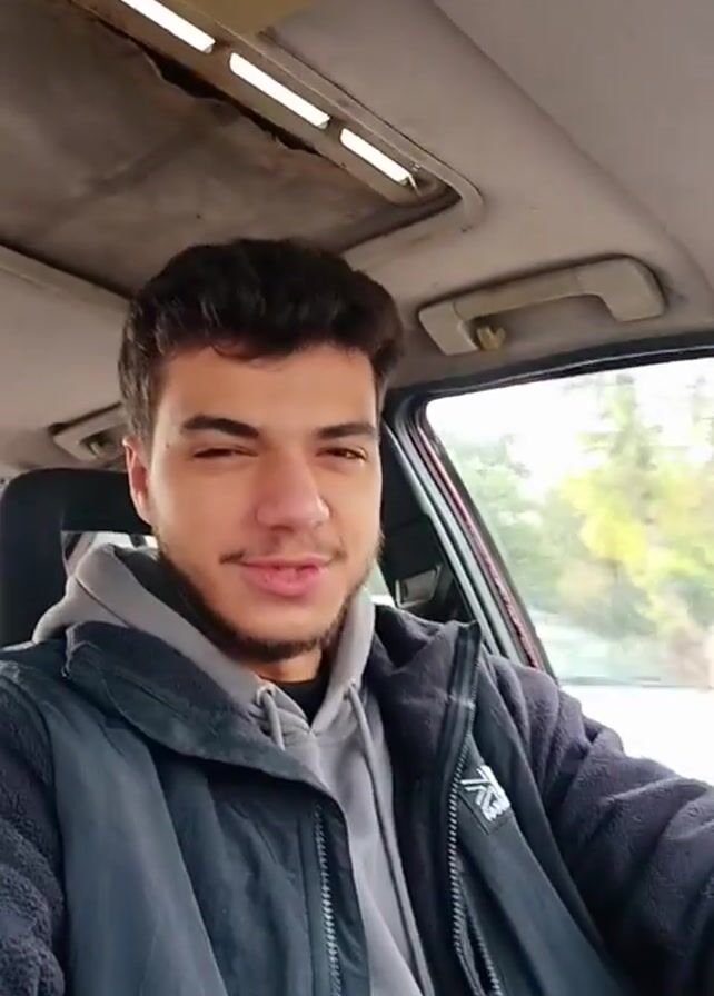 A young man with dark hair and a beard is driving a car. He is wearing a gray hoodie and a black jacket. He is looking at the camera and talking. The car has a sunroof. Outside the car, trees and a green space are visible.