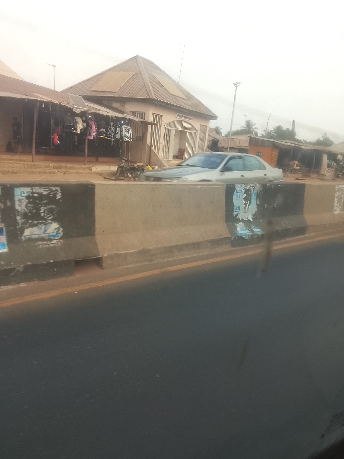 The image captures a street scene in Garaku, Nigeria, depicting a commercial area alongside a paved road under an overcast sky. In the foreground, a dark asphalt road surface is visible, separated from the roadside by a two-toned concrete barrier. The barrier's upper section is dark grey, while the lower section is lighter concrete, with several torn paper posters adhered to its surface. A single faded orange-yellow line runs along the right edge of the paved road. Behind the concrete barrier, a reddish-brown dirt strip runs parallel to the road. Along this strip, several structures and objects are present: 1. On the left, an open-fronted stall with a corrugated metal roof supported by wooden poles displays numerous clothing items, primarily t-shirts, hanging on racks. Two human figures are vaguely visible within the shaded interior of this stall. A small solar panel is mounted on its roof. 2. Adjacent to the stall, a light-colored, single-story building features a prominent pitched roof, appearing to be brown-tiled or corrugated. Two rectangular solar panels are mounted on this roof. The building has an arched entrance with vertical security bars or a gate, above which a sign, partially obscured, reads "F.M.P. MINISTRIES" or similar. 3. A silver-colored sedan is parked or stationary in front of this central building, with its lower section obscured by the foreground barrier. 4. A motorcycle is parked on the dirt strip between the open-fronted stall and the central building. 5. Further to the right and receding into the background, additional single-story buildings with corrugated roofs are visible, alongside scattered tropical vegetation, including palm trees. A grey streetlight pole with a single luminaire stands behind the silver sedan. The sky is uniformly light grey, indicating an overcast condition. No specific actions or interactions of the visible human figures are clearly discernible due to distance and image resolution.
