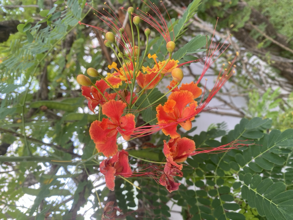 The image displays a close-up of a flowering plant. The central subjects are clusters of vibrant red-orange blossoms and numerous unopened yellow-green buds. Each open flower features five petals, primarily bright red-orange, with some petals exhibiting yellow edges or markings. Long, slender, red stamens tipped with small yellow anthers protrude prominently from the center of each bloom. Several flowers on the left side appear to be past their prime, showing faded, brownish, and shriveled petals. The foliage consists of pinnately compound leaves with numerous small, oval, dark green leaflets. Several elongated, flat, green seed pods are visible among the leaves. The background is softly blurred, revealing additional green foliage, darker tree branches, and hints of a light-colored structure, likely a building or wall. The scene is illuminated by natural daylight. No people or interactions are present. The specific location within the city of Accra, Ghana, cannot be determined from the visual information provided.