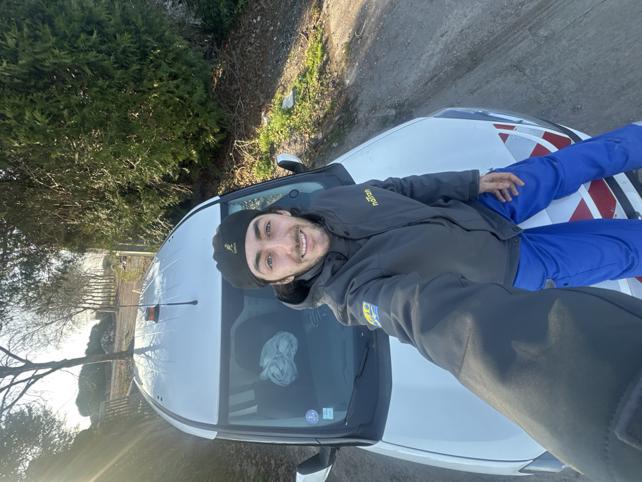 The image depicts an outdoor scene in Carvin, France, on a dirt path. A male individual, appearing to be between 20 and 35 years old, with dark hair and a beard, is visible in the foreground. He is taking a selfie, smiling directly at the camera. He wears a black beanie with a yellow Kangol logo, a dark grey zippered jacket featuring "naïran" in yellow text on the right chest and a multi-colored emblem on the left sleeve, and blue pants. He is positioned in front of a white utility vehicle, possibly a van or commercial vehicle. The vehicle displays red and white diagonal reflective hazard stripes on its lower front section and has an orange beacon light mounted on its roof. A crumpled white object is discernible on the passenger seat through the windshield. The immediate environment includes the dirt path, sparse ground vegetation, and a dense green coniferous hedge on the right. In the background to the left, bare deciduous trees are visible under bright sunlight.