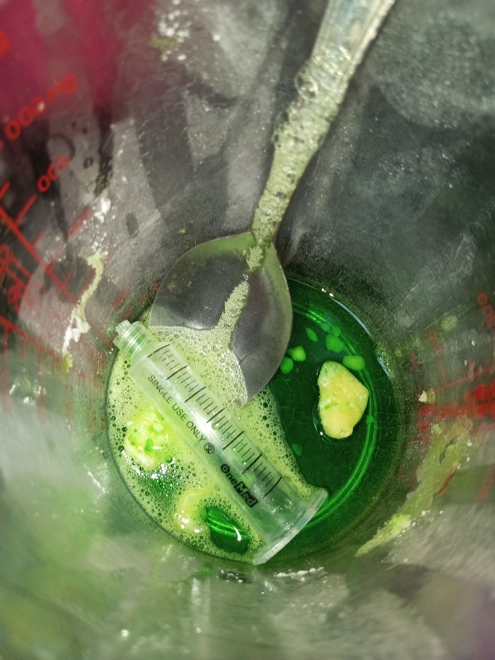 An overhead shot inside a metal measuring cup filled with green liquid. A spoon coated in green substance rests within, alongside a clear, plastic syringe labeled "SINGLE USE ONLY" and "OneMed." Chunks of a yellow-green solid float in the liquid. The cup's measuring lines and remnants of a white powder are visible.