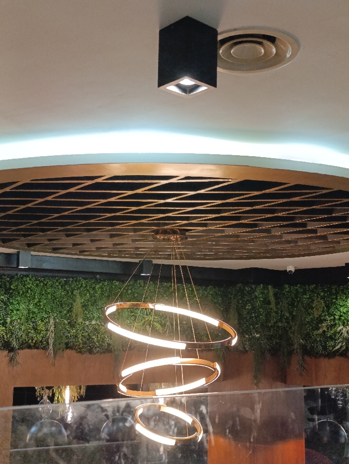 This interior scene, located in the city of Salé, Morocco, depicts a modern space characterized by specific lighting and decorative elements. The overhead white ceiling features a black, cuboid spotlight fixture emitting white light and a circular air vent. Below this main ceiling, a curved architectural recess contains a linear cool white light strip, illuminating a suspended decorative ceiling panel composed of a dark grid with gold-colored square divisions. A central feature is a contemporary chandelier, suspended by thin wires. It consists of three vertically arranged, concentric rings of varying diameters (largest at the top, smallest at the bottom), each emitting a warm white light along its circumference. In the background, a wall is partially covered by a dense green artificial plant installation, resembling a vertical garden, with some foliage extending downwards. Beneath this greenery, a section of a reddish-brown, possibly textured, wall is visible. A white security camera (CCTV) is discreetly mounted on a dark structural element in the upper right background, near the ceiling line. The lower foreground shows a blurred, reflective glass barrier with indistinct reflections of the interior space. No individuals, actions, or direct interactions are visible in the frame.