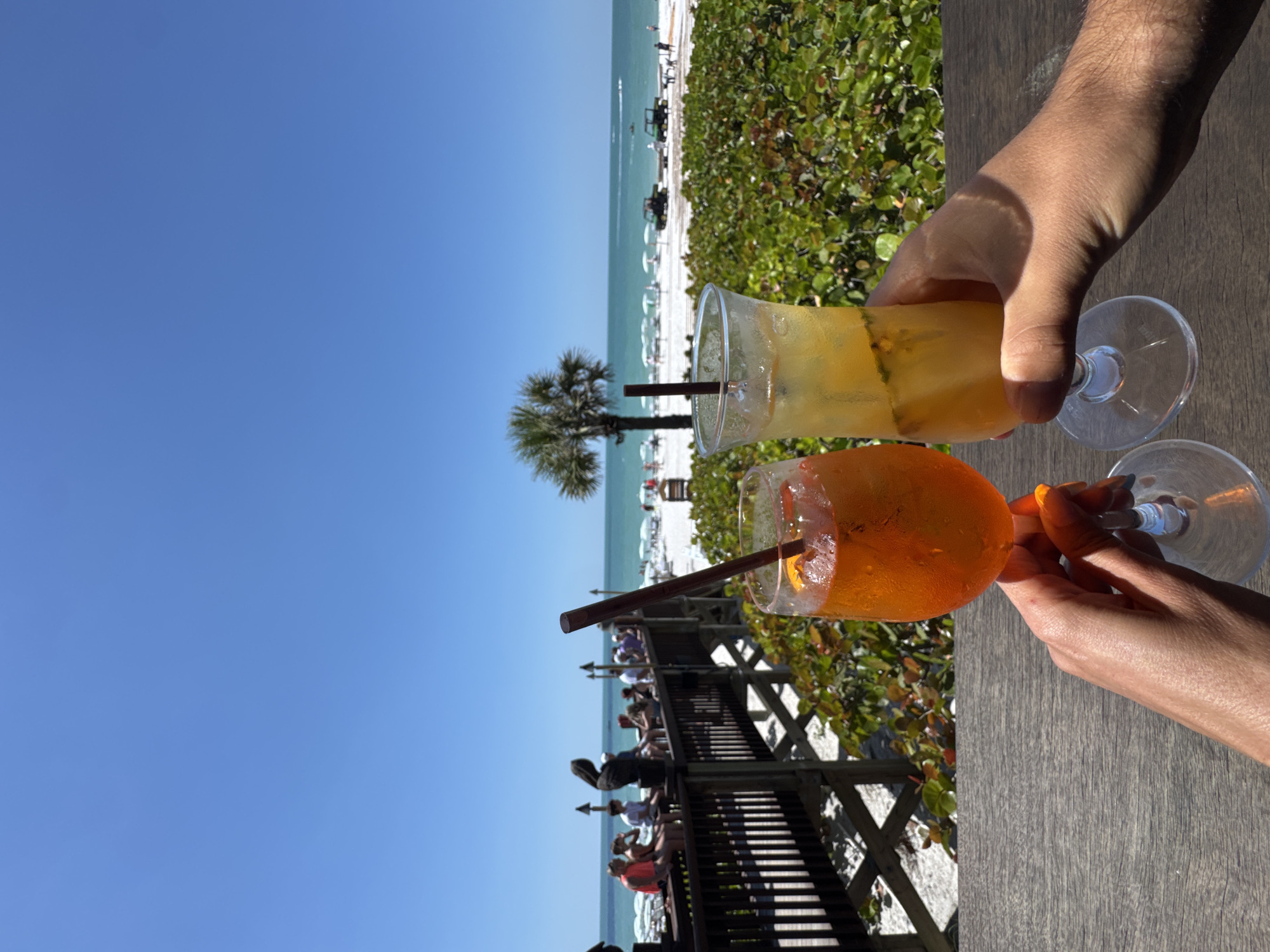 This image depicts a sunny beach scene in Pelican Bay, USA, viewed from an elevated perspective over a weathered wooden tabletop. In the immediate foreground, two hands are visible, each holding a clear stemmed cocktail glass aloft. The left hand, featuring orange nail polish, holds a glass containing an orange-hued beverage with ice, an orange slice garnish, and a dark brown straw. The right hand, appearing masculine and hairy, holds a similar glass containing a yellowish-orange beverage with ice and a dark brown straw. Both hands are positioned as if in a toast. Beyond the foreground and a patch of lush green shrubbery, a multi-level wooden boardwalk structure extends across the midground. Numerous casually dressed individuals are present on the boardwalk, some seated on its railings which are adorned with dark, carved bird figures, while others stand, observing the beach. The background reveals a wide expanse of white sand beach, populated by scattered individuals, including children, and numerous white beach umbrellas. Two dark, utility-style vehicles are parked on the sand near the water's edge. A single palm tree stands prominently on the beach towards the center-right. The tranquil turquoise ocean extends to the horizon, showing gentle waves and distant dark objects, possibly watercraft. The sky overhead is clear and bright blue, indicating a cloudless day.