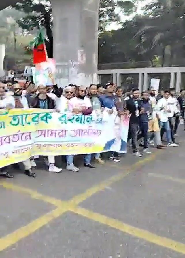 A crowd of people are walking down a street. They are holding a banner that says "Tarek Rahman". Some people are also carrying flags with green and red colors. One person is speaking into a megaphone. The street is lined with trees and there is a highway overpass above. Some people are wearing t-shirts with a picture of a person on them.