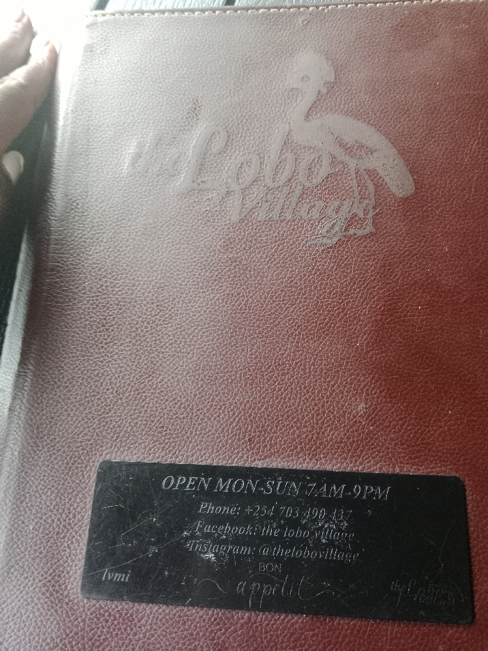 red, leather-bound menu cover for a restaurant called "The Lobo Village" located in Eldoret, Kenya (latitude: 0
