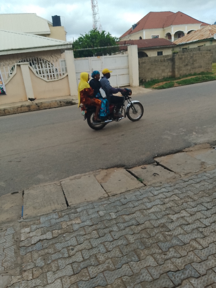 Three individuals are depicted in motion on a silver-colored motorcycle on a paved asphalt road in Lokoja, Nigeria