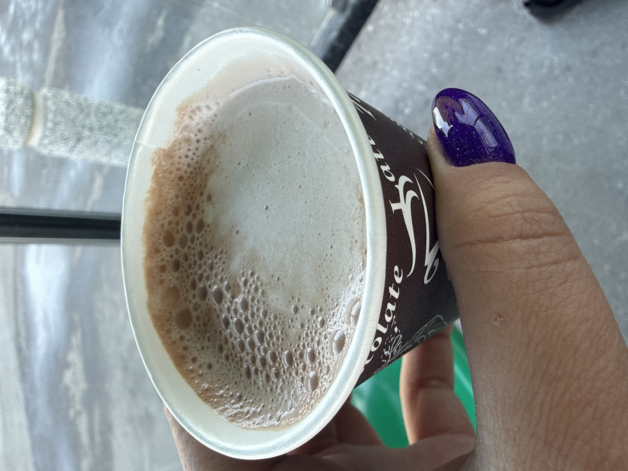 A close-up image shows a person's right hand holding a brown disposable paper cup filled with a hot beverage, likely hot chocolate or a latte, topped with a thick layer of light brown and white foam featuring numerous bubbles