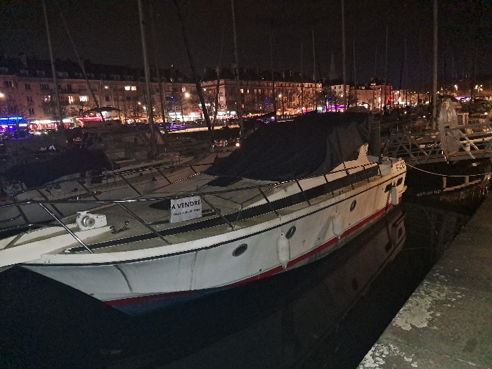 At night, a white boat with a dark cover sits in a harbor next to a concrete pier. "A Vendre" (For Sale) is visible on the boat. A red stripe runs along the lower hull. In the background, buildings and streetlights are blurred, suggesting a city scene along the waterfront. Many boat masts extend towards the dark sky. The water is black and reflective.