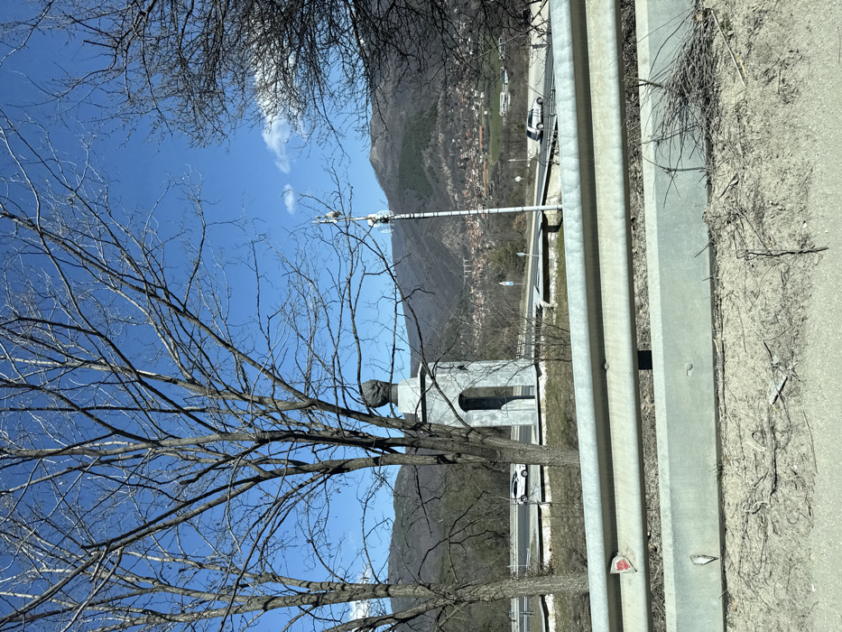 The image depicts an outdoor scene in Bunovo, Bulgaria, under a clear blue sky, indicative of late winter or early spring. In the immediate foreground, a three-tiered metallic gray guardrail is present, obscuring the ground level, which consists of dry, light brown earth with sparse, dead vegetation. Dominating the midground is a light gray stone monument. It features a tall, rectangular base with an arched opening, topped by a dark, rounded bust-like sculpture. This monument is positioned behind the guardrail and partially framed by several tall, bare deciduous trees with visible branches and twigs. To the right of the monument, a highway with multiple lanes is visible, on which a white car or SUV is traveling leftward. Further right, another white vehicle is also on the highway. A slender, white pole equipped with several antennae extends vertically into the sky, situated to the right of the monument. The background reveals a wide valley landscape. A town, identified as Bunovo, is situated in the valley to the right, characterized by numerous buildings with visible roofs. Behind the town and monument, rolling hills and mountains, primarily covered in bare or sparsely vegetated trees, rise towards the horizon. A prominent concrete viaduct or bridge, featuring multiple arches, spans a valley in the mid-distance to the left of the town. The sky is bright blue with a few scattered, small white clouds. No individuals are visible in the scene.