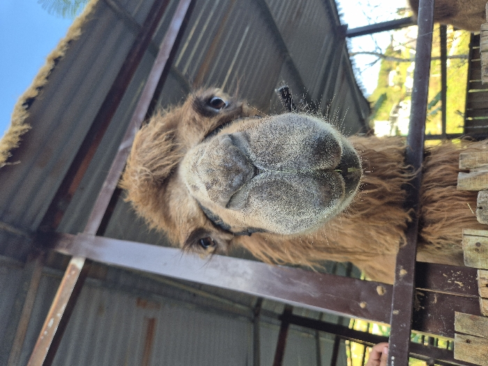 - "A medium close-up, low-angle photograph captures the head and upper neck of a light brown, shaggy-furred camel looking directly forward" by FM-vOprn2, licensed under CC BY 4.0