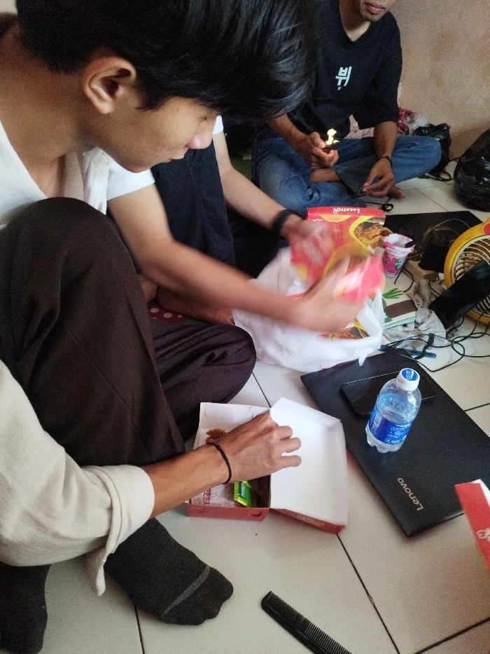 The scene depicts an indoor gathering of at least three individuals seated on a light-colored tiled floor in Muka, Indonesia. In the foreground, a male with dark hair, wearing a white short-sleeved shirt, dark brown pants, and a dark grey sock on his visible foot, is opening a white take-out food box with his left hand, revealing a green packet and food item. A black bracelet is visible on his left wrist. His right hand is reaching into a white plastic bag situated near a red "Lazzaro" branded box. To his right, another male with dark hair, wearing a black t-shirt with a white character (뷔) and blue jeans, sits cross-legged, holding a lit lighter in his right hand. The legs of a third individual, also wearing jeans, are partially visible in the far background. On the floor, near the individuals, are a black Lenovo laptop with a black smartphone and an AQUA brand plastic water bottle placed on top, a black comb, various tangled cables, and a partially visible small yellow electric fan. A black plastic bag is also visible in the right background. The room features a plain, light brown wall.