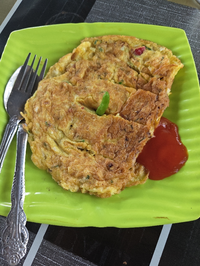 A close-up, overhead view displays a meal served on a bright lime green, rectangular plate in Reudeuep, Indonesia. The central subject is a large, golden-brown omelet or fried egg preparation, exhibiting a folded appearance and a visible texture of cooked egg with inclusions of green and red finely chopped elements. A single, upright green chili pepper is centrally embedded within the omelet. Adjacent to the omelet on the right side of the plate is a substantial dollop of thick, bright red sauce. To the left of the omelet, a silver-colored metal fork and spoon, both featuring ornate handle designs, are positioned. The plate rests on a dark surface, characterized by a pattern of alternating dark gray and black rectangular or striped sections, indicative of a tabletop or placemat. No people, specific actions, or interactions are visible.