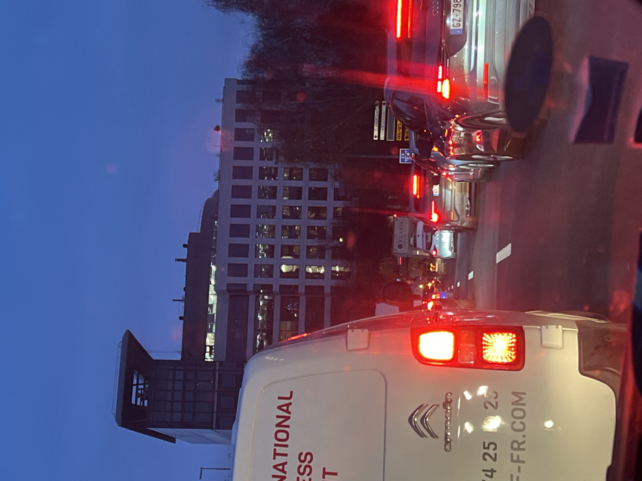 A low-angle shot taken from a car shows a traffic jam. Buildings rise in the background against a blue sky. The taillights of multiple vehicles are illuminated, creating streaks of red light. A white Citroen van is prominent in the foreground, with visible company branding. A license plate on a car near the front of the line reads "GZ-796." The overall atmosphere suggests a congested urban environment at dusk.