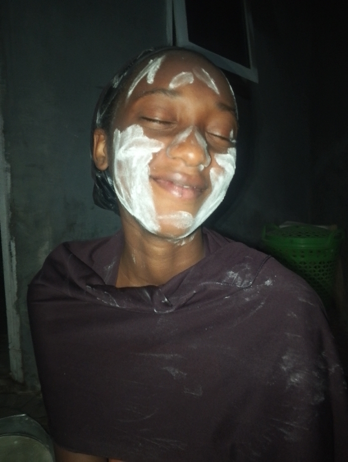 A smiling person with eyes closed and a white substance applied to the face. The white substance is dabbed on the forehead and covers the cheeks and chin. The person wears a dark head covering and is draped in a dark maroon shawl. There are specks of the white substance on the shawl. A green basket is partially visible in the background.