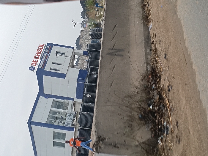 The scene depicts an outdoor urban environment in Orifite, Nigeria, under an overcast sky. A two-story commercial building dominates the mid-ground, featuring a white facade with blue accent panels. A red sign on the roof reads "DE CHISOL" with a bird logo, and "ENIBEZE CONCEPT INT'L LTD" is visible below it. The building exhibits varied window designs, including large framed windows on the upper left section and narrow vertical windows on the right section. In front of the building, numerous black, cylindrical plastic water tanks are arranged in rows. A light pole equipped with a solar panel and a luminaire stands on the right side, between the tanks and the building. In the foreground, a grey concrete barrier runs horizontally across the image. Its base is lined with dry, sparse vegetation and scattered refuse, including plastic debris. The ground immediately in front of the barrier is exposed dirt, transitioning to a paved road surface visible in the bottom right corner. A male individual, wearing an orange t-shirt and blue jeans, is captured in mid-stride, walking from left to right across the scene, positioned slightly above the concrete barrier. A second, indistinct individual, appearing to wear blue attire, is partially visible in the far background on the right side of the image. The background beyond the building reveals additional distant structures and utility poles beneath a uniformly grey sky.