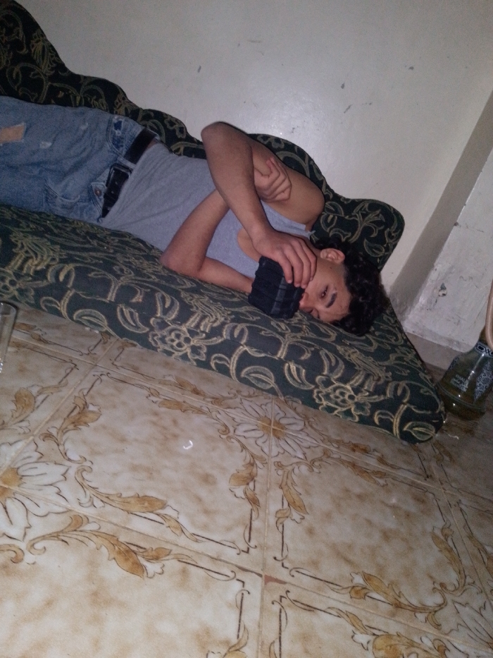 A person is lying on a green and black patterned cushion on a tiled floor. They are wearing jeans, a gray t-shirt, and a black wristband or hair tie on their left wrist. Their face is partially covered by their hand. A glass and a glass bottle are on the floor near the edge of the cushion. The background includes a white wall and a corner of what appears to be another wall.