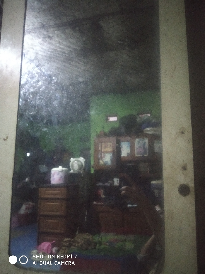 The image depicts a distorted reflection captured in a dusty or smudged mirror, providing a view of an interior room within a location in Lumajang, Indonesia