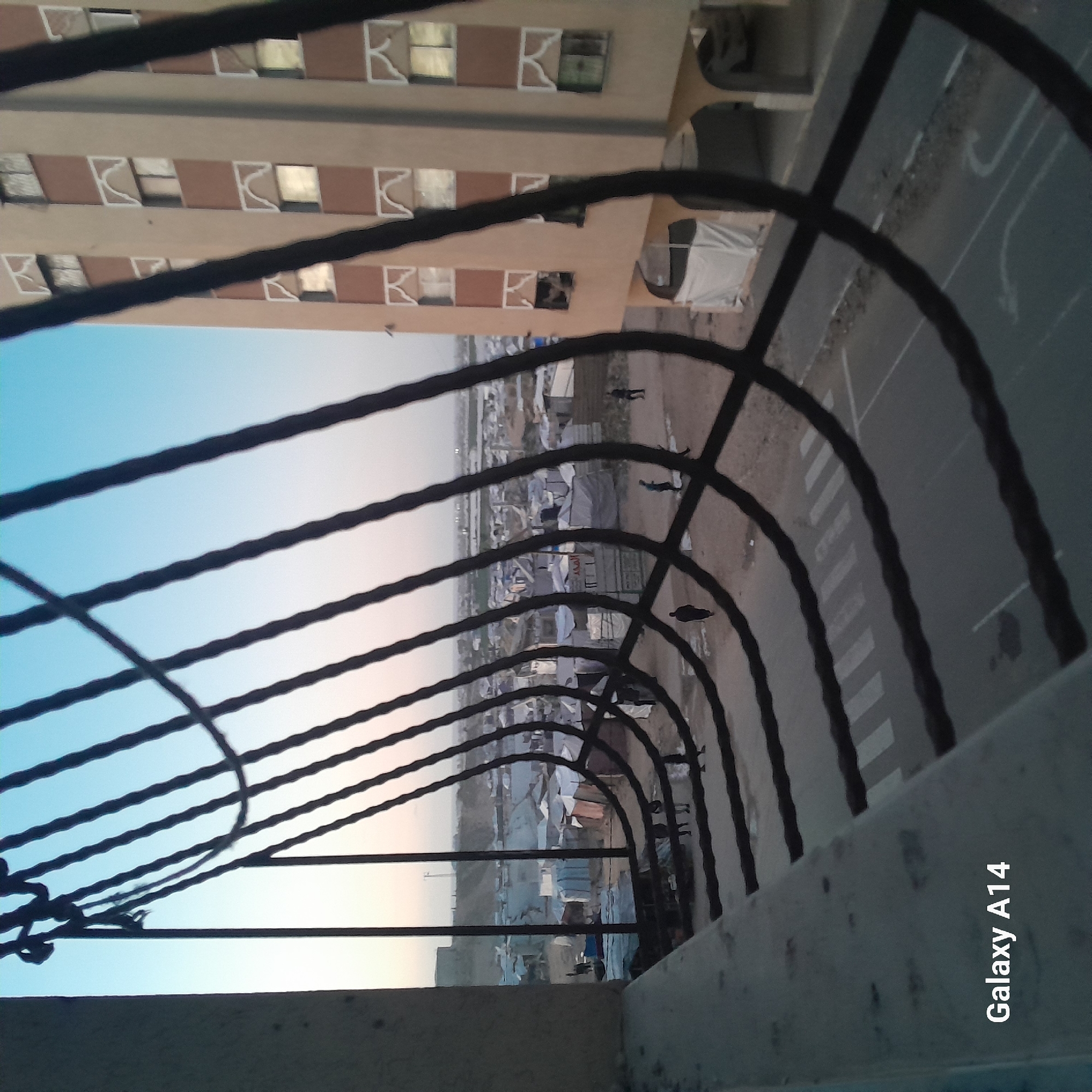 View from a high-rise balcony in Khan Yunis, Palestinian Territory. The foreground features a metal railing. In the midground, there is a dense concentration of tents and makeshift shelters, indicative of a refugee camp. People are visible moving around the camp. Beyond the camp, a road with a crosswalk is observed. Further in the background, another building with patterned window frames is visible against a pale sky. The "Galaxy A14" watermark is present in the lower right corner of the image.